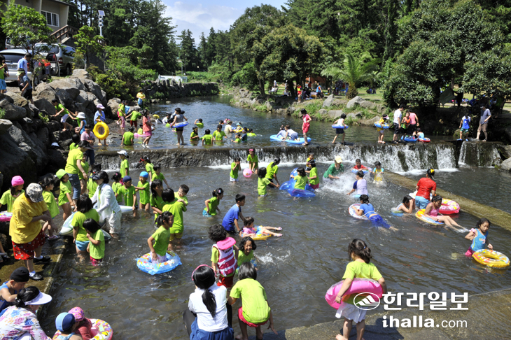 | 정방폭포 상류 정모시. 이곳 물을 끌어다 1.2㎞ 길이의 인공수로를 통해 서귀진지로 보냈으며 원도심 일대에는 논농사와 밭농사가 이뤄졌다. 현재 정모시는 여름철 피서 유원지로 각광을 받고 있다. 강경민 사진작가 |