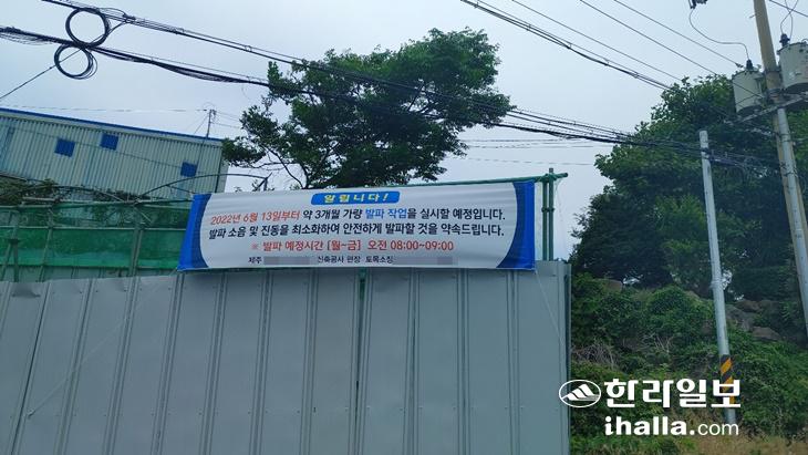 제주시 애월읍 수산리 공사 현장에 6월부터 3개월에 걸친 발파 작업을 알리는 현수막이 붙어 있다.