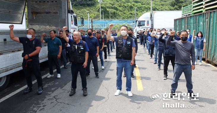 화물연대 제주본부 조합원과 관계자들이 15일 제주항 6부두에서 총파업 해단식을 진행하고 있다. 김도영기자