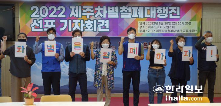 2022 제주차별철폐대행진 공동기획단이 20일 제주도의회에서 선포식을 열고 있다. 김도영기자