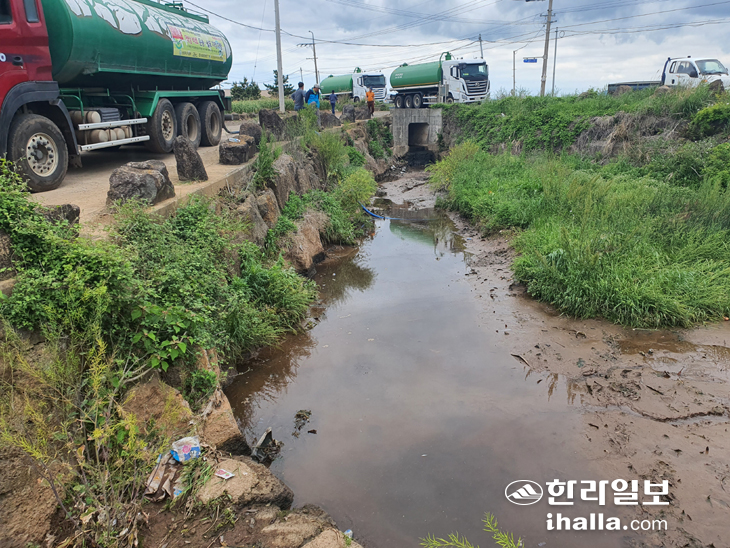 | 하천으로 유입된 불법 배출 분뇨를 차량을 통해 수거하는 모습. |