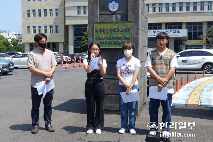 제주여고 인권침해사건 진정인들이 22일 제주도교육청 앞에서 기자회견을 열고 있다. 김도영기자