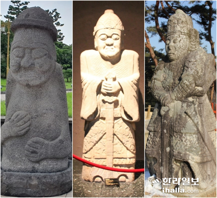 | 사진 왼쪽부터 제주 돌하르방(국립제주박물관), 15세기 명나라 무관석(낙양 박물관), 15세기 조선 세종 무관석(여주 영릉). 세 개의 조각상의 머리와 눈, 손 동작이 유사하다. 사진=김문환 고려대 연구교수 |