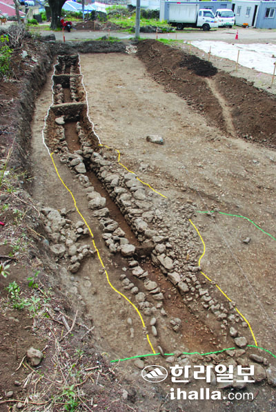 | 서귀진지 배수로 유적. 400여 년 전부터 서귀포 선인들은 인공수로를 통해 정방폭포 상류 정모시 물을 서귀진지까지 끌어다 활용했다. 제주문화유산연구원 제공. |