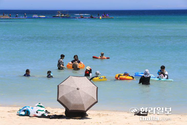 제주도 내 해수욕장 개장 첫날인 1일 오후 제주시 조천읍 함덕해수욕장을 찾은 피서객이 물놀이를 하고 있다. 연합뉴스