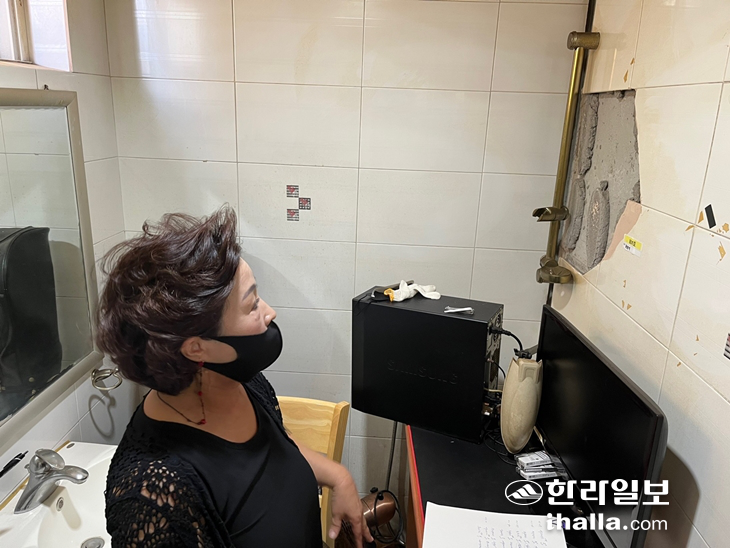 | 주택 욕실 타일이 불규칙한 패턴으로 탈락돼 있다. 송은범기자 |