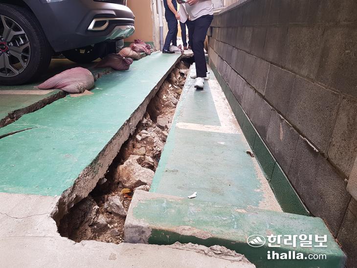 4일 제주시 이도2동 소재 모 아파트 주차장에는 지진이라도 난 듯 바닥이 갈라져 있었고, 심하게 기울어져 있는 담벼락에는 추가 기울임을 막기 위한 쇠파이프가 설치돼 있었다. 아파트로 들어가 일부 주택 내부를 살펴 보니 안방 나무 문틀이 벌어져 있었으며, 욕실 타일은 불규칙한 패턴으로 탈락돼 있었다. 이 아파트는 지난 2004년 지상 12층·지하 1층 규모로 지어졌으며, 총 38세대·약 100명의 주민들이 살고 있다.
