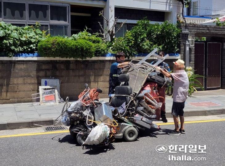 지난 3일 낮 12시17분쯤 제주시 도남동의 한 도로에서 전동 휠체어에 고물을 싣고 가는 어르신이 도로에 고물이 떨어지며 위험해 보인다는 신고가 경찰에 접수됐다.