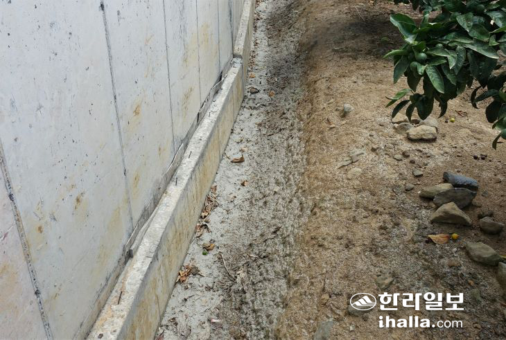 B 씨는 밭 이곳저곳에서 날아온 시멘트 가루의 흔적을 확인시켜줬다. 감귤 나무 아래쪽은 물론이고 배수로를 따라 회백색의 가루가 쌓여 있었다.