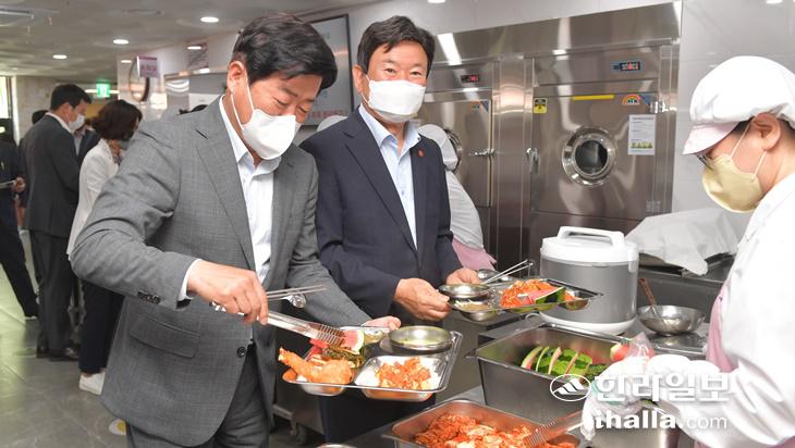 지난 6일 한라중학교를 찾아 학교급식을 배식받고 있는 오영훈 지사(왼쪽)과 김광수 교육감(오른쪽). 한라일보 DB