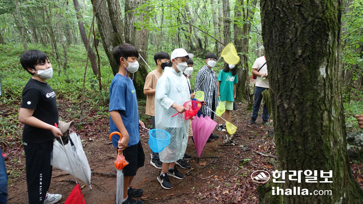 채집한 노랑가지나방을 다시 나무로 돌려보내 준 뒤 학생들은 한라산 둘레길 하원수로길을 따라 천천히 걸어가며 주변 나무와 곤충들을 만났다.