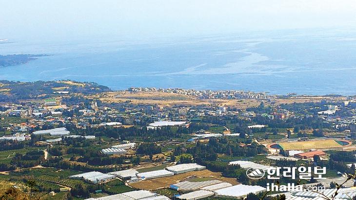 서귀포시 서부 지역에 있는 군산오름에서 바라본 마을 전경.