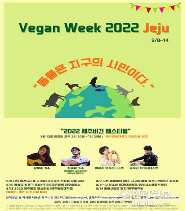 [한라일보] 채식을 활성화하고 동물 복지를 함께 고민하는 장인 '비건 위크 2022 제주'가 8월 8일부터 14일까지 이어진다.