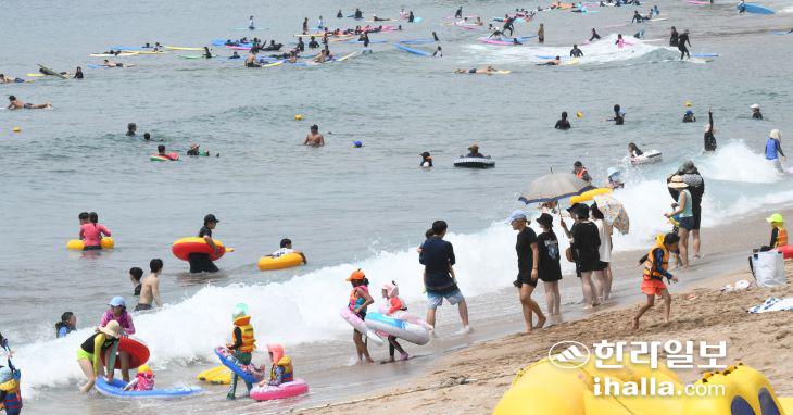 23일 서귀포시 중문색달해수욕장을 찾은 피서객들이 물놀이를 즐기고 있다. 이상국기자