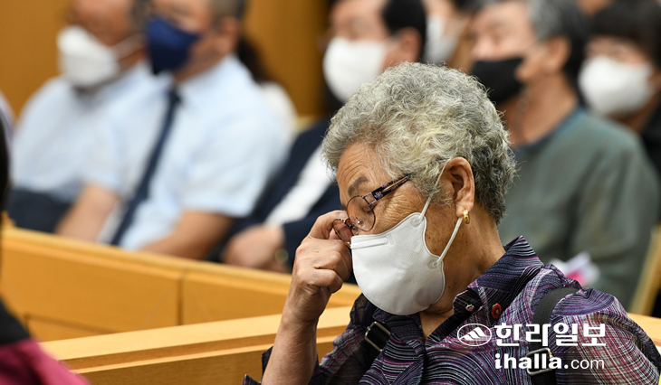 4·3희생자 유족인 김옥자(80) 할머니가 재판을 청취하고 있다. 강희만기자