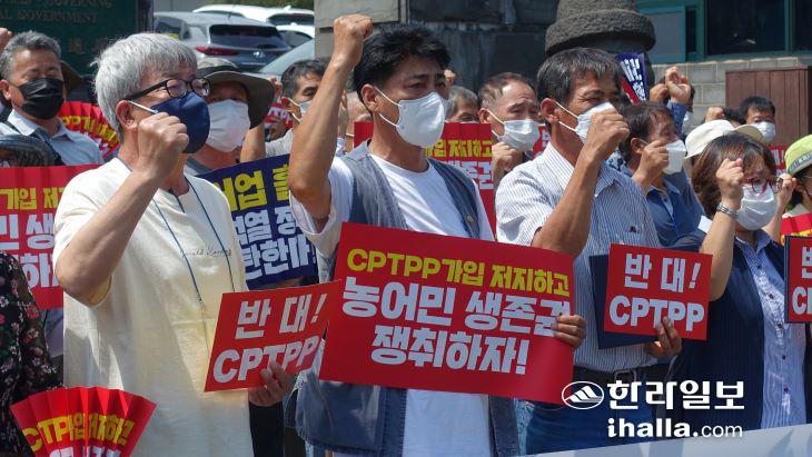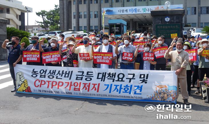 [한라일보] 전국농민회 제주도연맹과 전국여성농민회 총연합 제주도연합 등은 27일 제주도청 앞에서 기자회견을 열고 농업 생산비 급등에 따른 대책 마련과 정부의 CPTPP 가입을 반대한다고 밝혔다.