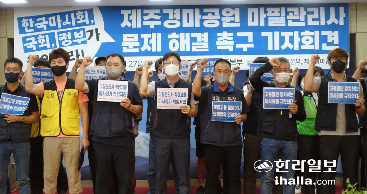 민주노총 제주본부와 공공운수노조 제주지역본부, 공공운수노조 제주경마공원지부는 27일 제주도의회 도민카페에서 기자회견을 열고 "한국마사회와 정부, 국회는 마필관리사 고용 관련 문제 해결을 위해 나서 달라"고 촉구했다.