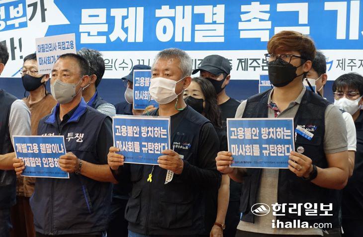 [한라일보] 제주경마공원 마필관리사들의 고용 문제 해결을 촉구하는 기자회견이 열렸다.