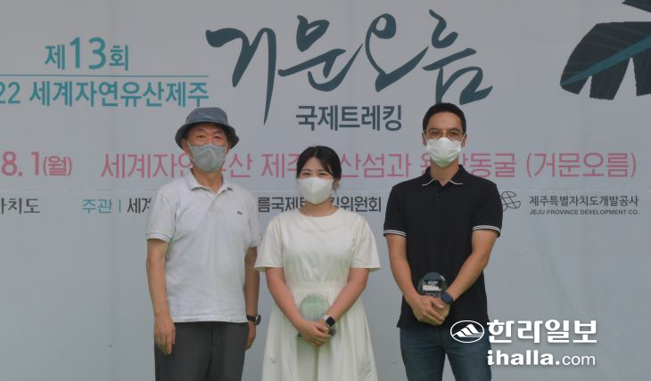 | '거문오름 국제트레킹 홍보대사'로 위촉된 오인영(가운데) 씨와 안재민(오른쪽) 씨. 이상국기자 |