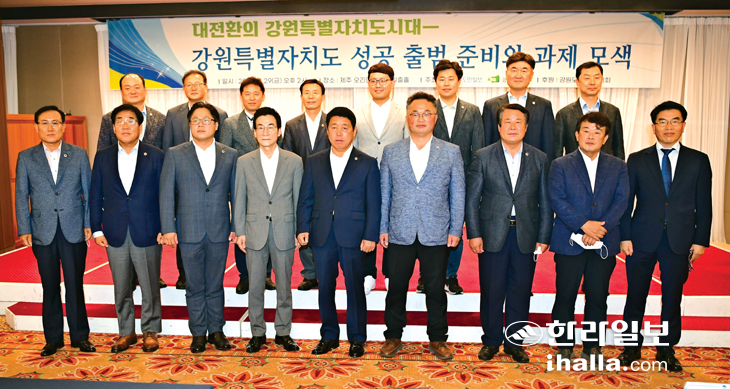| 한라일보와 강원도민일보, 강원연구원이 공동주최·주관하고 강원도와 강원도의회가 후원한 '대전환의 강원특별자치도시대-강원특별자치도 성공 출범 준비와 과제 모색' 심포지엄이 29일 오후 제주 오리엔탈호텔 일출홀에서 열렸다. 강희만기자 |