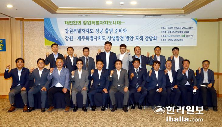 지난 29일 제주오리엔탈호텔에서 열린 '대전환의 강원특별자치도시대-강원특별자치도 성공 출범 준비와 과제 모색' 심포지엄에 앞서 가진 '제주·강원특별자치도 상생발전 방안 모색 간담회'에서 양 도와 양 도의회 관계자들은 이같이 다짐했다.