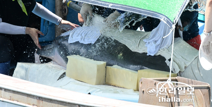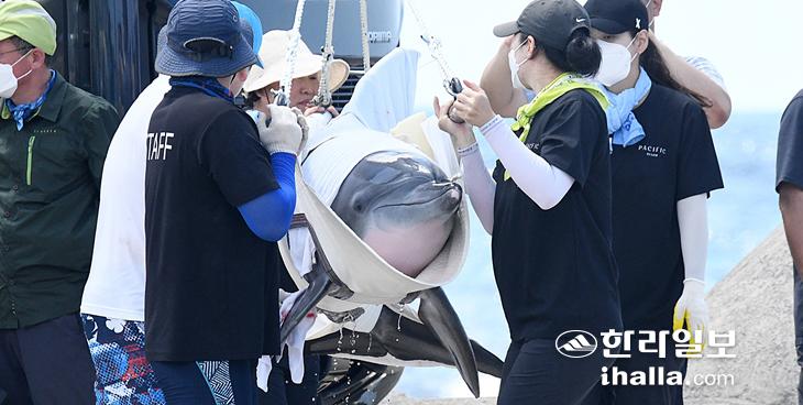 남방큰돌고래 비봉이가 4일 서귀포시 대정읍에 위치한 해상 가두리 훈련장에 옮겨지고 있다. 이상국기자