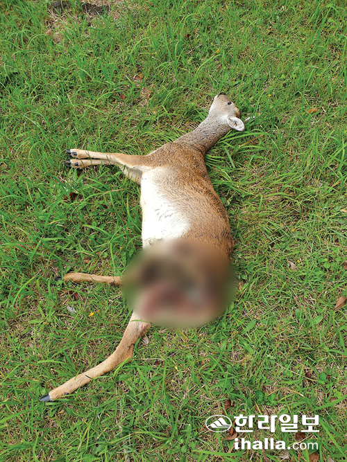 | 들개에 물려 폐사한 것으로 추정되는 노루 사체. 사진=야생생물관리협회 제주도지부 |