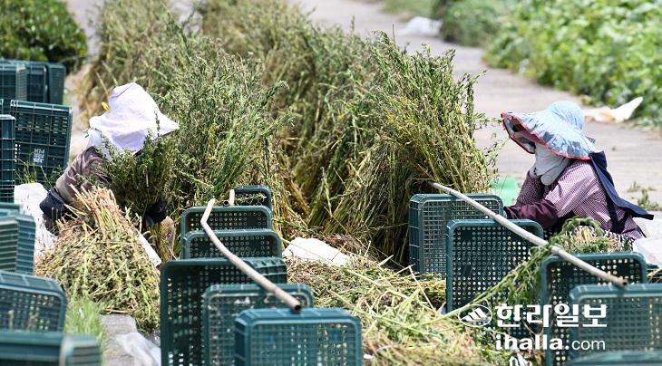 8일 제주시 한경면 용수리의 한 도로에서 마을 어르신들이 갓 수확한 참깨를 말리고 있다. 이상국기자