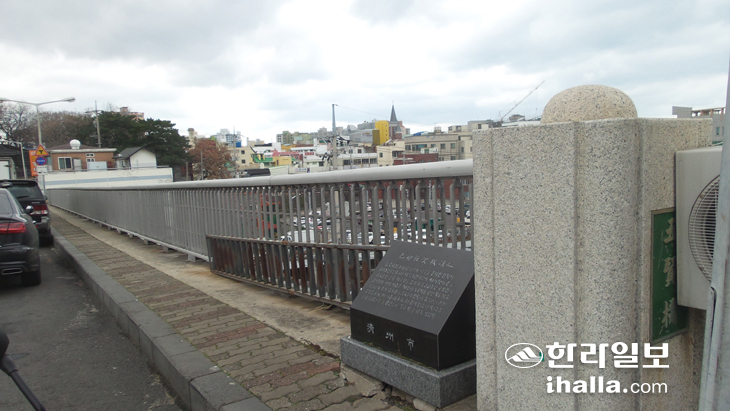 | 제주시 오현교 위에 설치된 을묘왜변 전적지 표지석. |