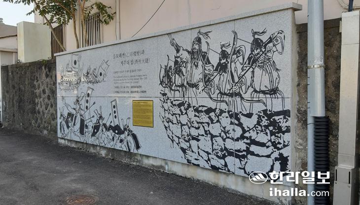 제주시 제이각 남쪽에 설치된 을묘왜변 대첩을 기리는 벽화.