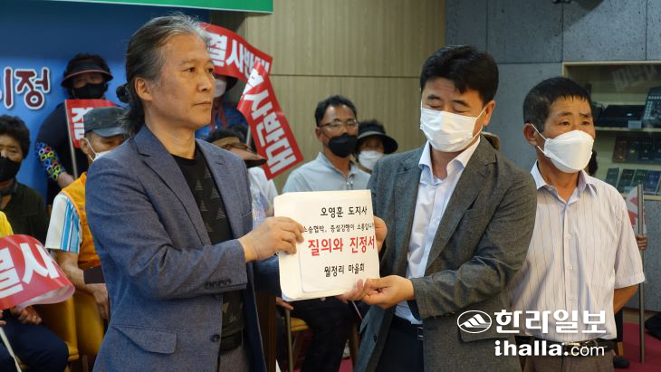 이후 동부하수처리장 증설의 문제점과 반대 서명운동 명부 등을 담은 진정서를 제주도지사 비서관을 통해 오영훈 도지사에게 전달했다.