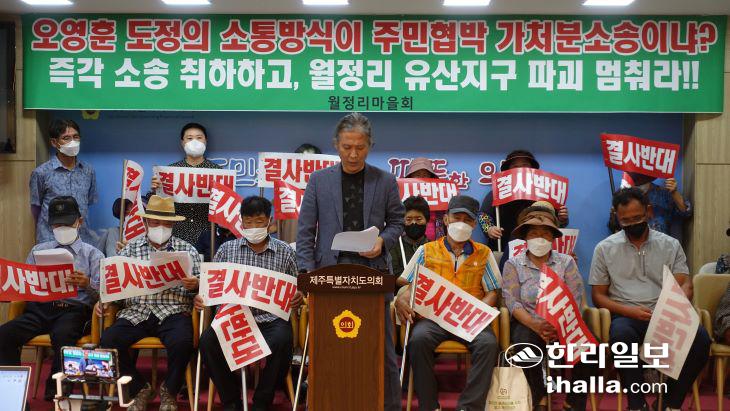 제주시 구좌읍 월정리 마을회와 주민들이 10일 제주도의회에서 기자회견을 열고 있다. 김도영기자