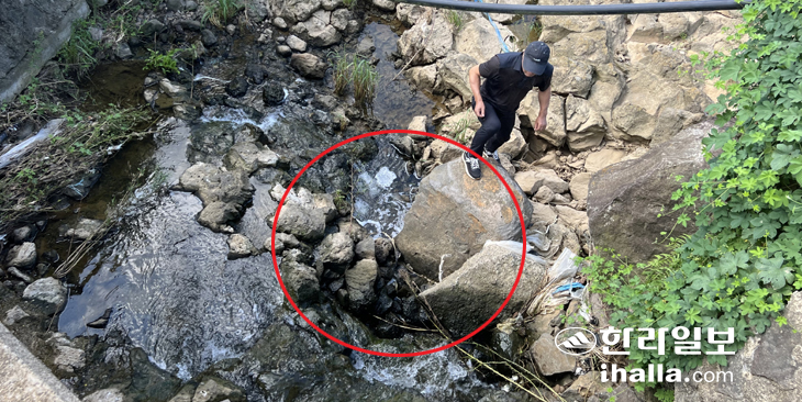 | 동일리 저류지 상부에 위치한 숨골로 1일 수백t의 하천수가 유입되고 있다.(원 안은 숨골) |