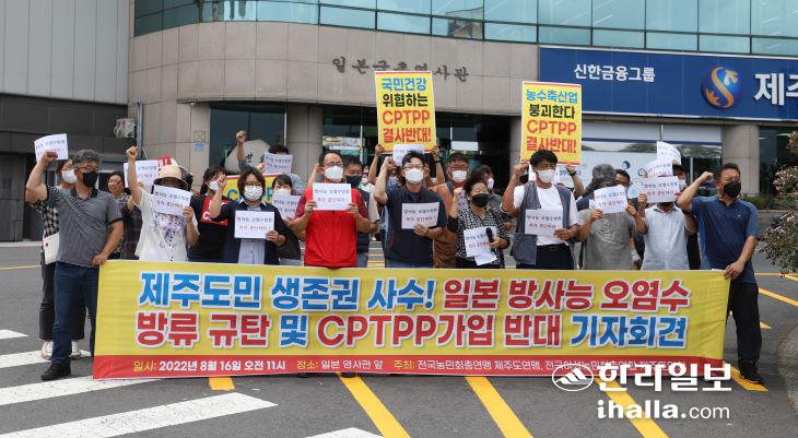 [한라일보] 전국농민회총연맹 제주도연맹과 전국여성농민회총연합 제주도연합(이하 농민단체)은 16일 주제주일본국총영사관 앞에서 기자회견을 열고 "일본은 방사능 오염수 방류계획을 즉각 철회하고 윤석열 정부는 굴종의 외교 굴욕의 경제 협상을 즉각 중단하라"고 촉구했다.