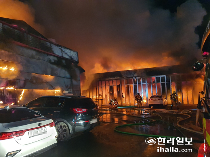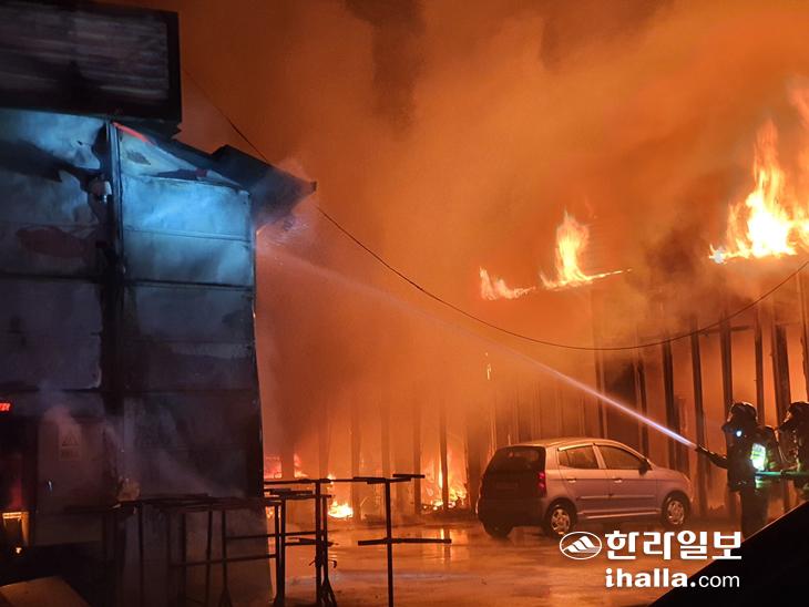 지난 18일 밤 일어난 제주 노형동 자동차 공업사 화재. 제주소방서