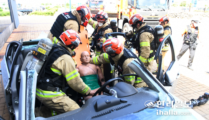 제주소방서는 24일 제주항 국제여객터미널에서 '긴급구조종합훈련'을 실시했다. 강희만기자