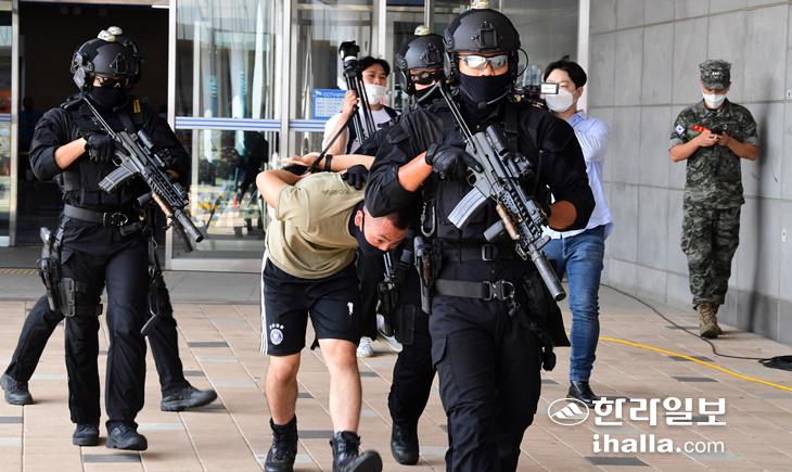 [한라일보]제주항 국제여객터미널에 테러범들이 침투한 상황을 가정한 훈련이 진행됐다.