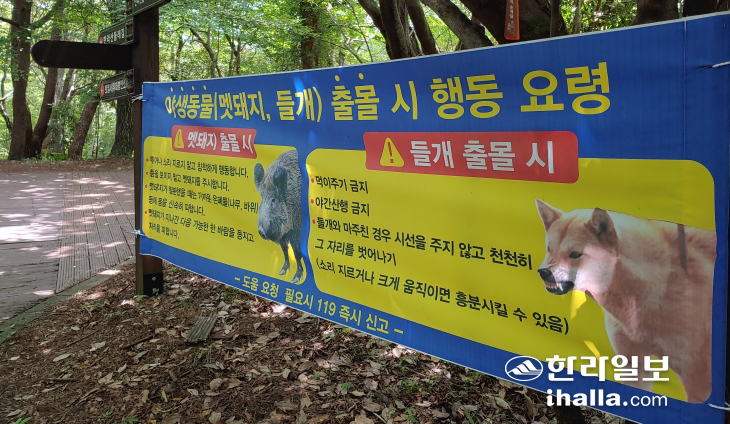 | 제주 한라산 둘레길 탐방로에 멧돼지와 들개에 대한 주의를 당부하는 현수막이 걸려 있다. 김지은기자 |