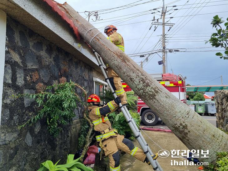 [한라일보] 제11호 태풍 '힌남노'가 제주섬과 가까워지면서 성인 몸통보다 튼 나무가 부러지는 등 피해가 이어지고 있다.