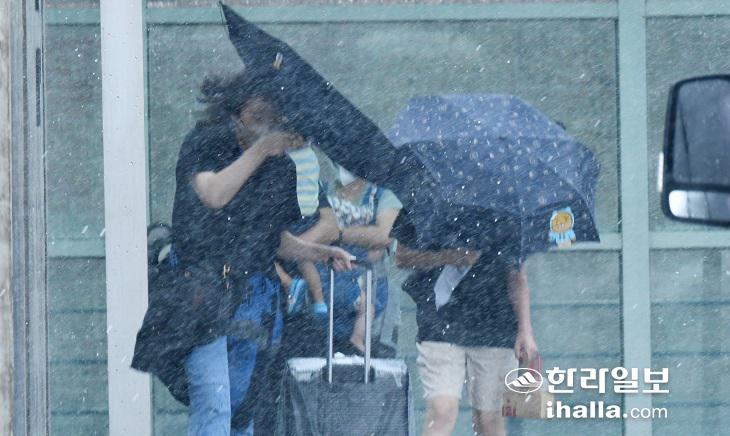 5일 제주국제공항에서 입도객들이 강한 바람에 몸을 가누지 못하고 있다. 이상국기자