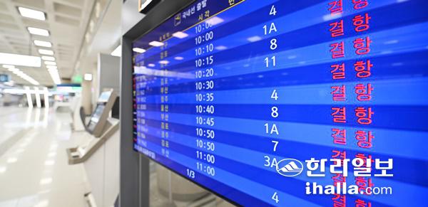 당초 이날 출발편 기준 98편이 사전에 결항 조처돼 총 239편(출발 117, 도착 122)이 운항 예정이나 모두 계획대로 운항할 수 있을지는 아직 미지수다.