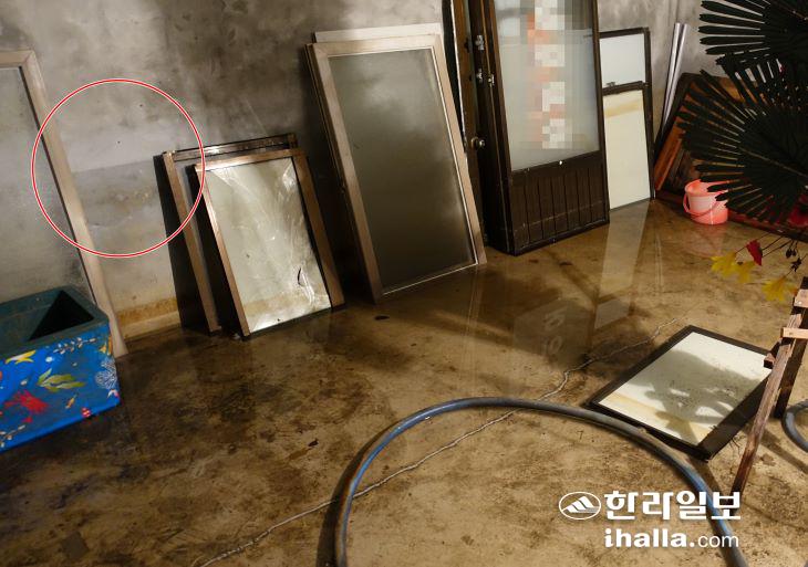 창고로 사용한 건물 지하는 침수로 인해 물품 피해가 발생했으며 성인 남성 허벅지 높이까지 들어찼던 빗물의 흔적이 벽면에 고스란히 남아 있었다.