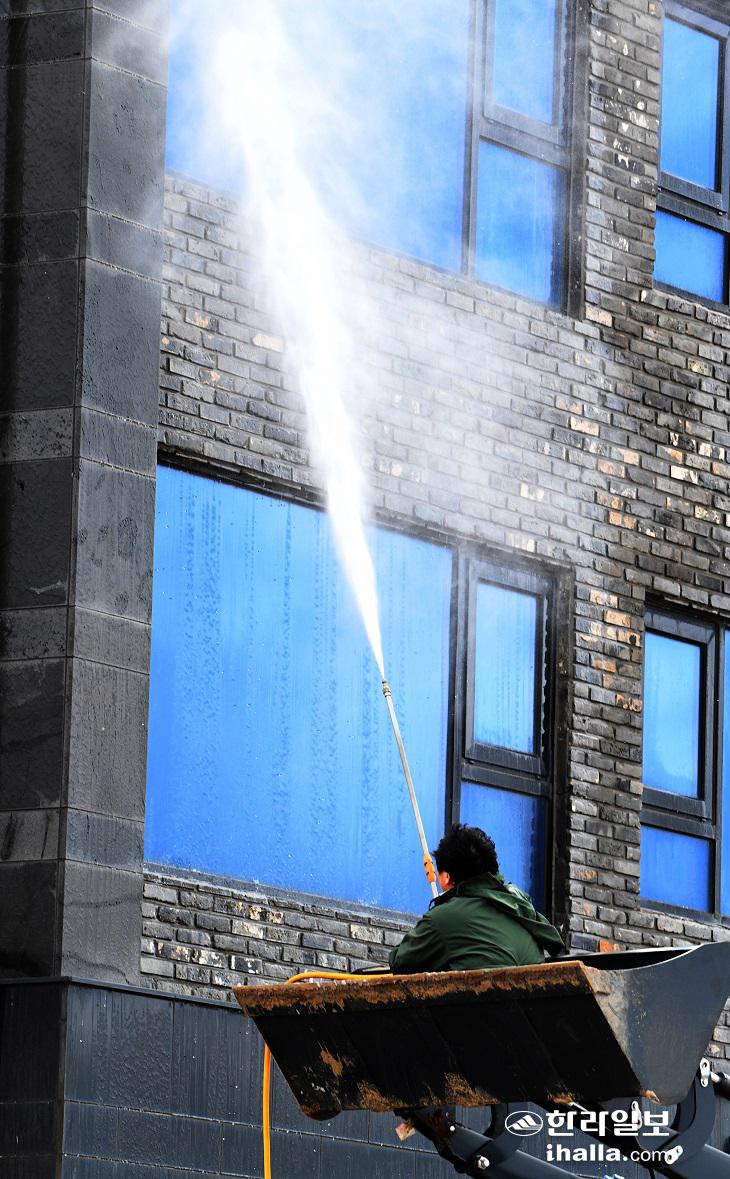 태풍 힌남노가 지나간 6일 서귀포 대정읍 신도리 한 건물이 바닷물을 뒤집어쓰자 긴급히 세척 작업을 하고 있다. 강희만기자.
