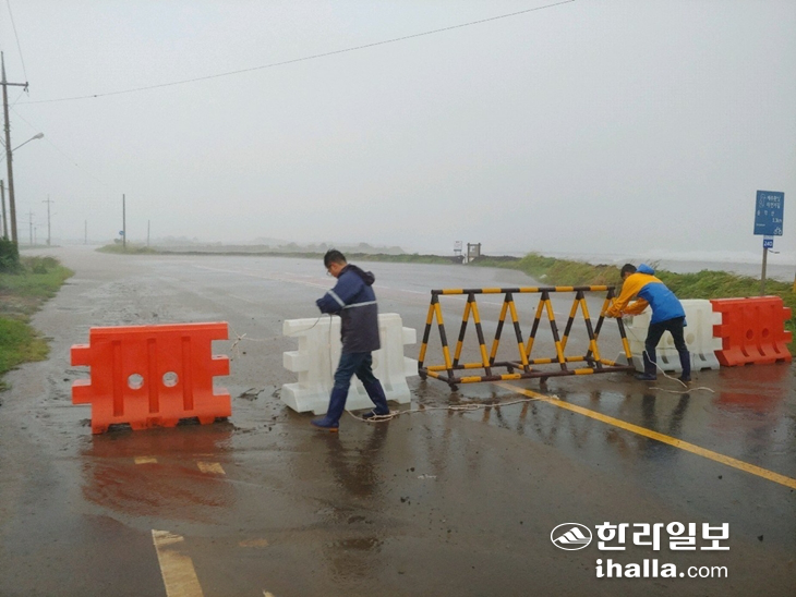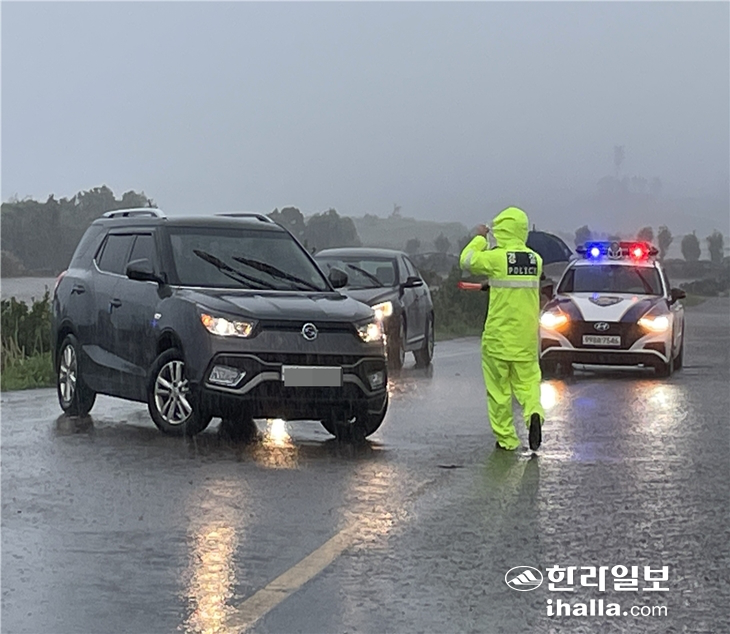 이에 따라 경찰은 대정읍 하모해수욕장 인근 해안도로 구간을 지난 4일부터 태풍이 지나간 6일 오전 7시까지 통제했다. 해당 도로 구간에 물이 들어차면서 운전자 고립 등 안전사고가 우려됐기 때문이다.