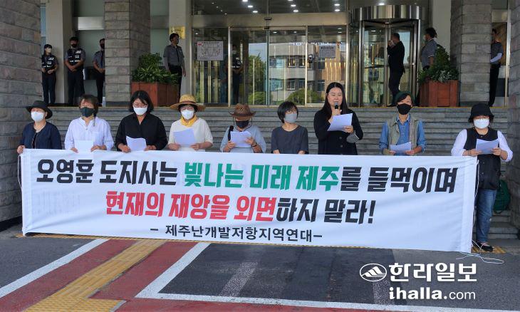 제주 난개발 저항 지역연대가 8일 제주도청 앞에서 기자회견을 열고 오영훈 도정의 책임 있는 갈등 해결을 요구했다. 김도영기자