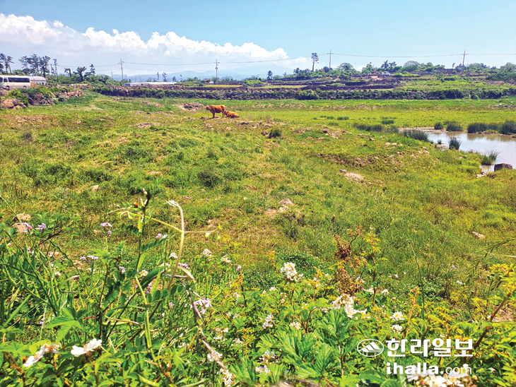 | 한라일보 숨골탐사특별취재팀이 지난 8월 8일 서귀포시 대정읍 동일리 저류지와 연결된 하천내 숨골 유입 지표수. |