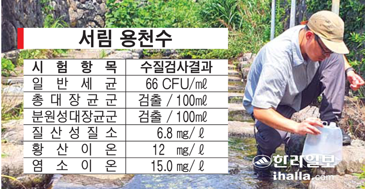 한라일보 숨골탐사특별취재팀은 지난 8월 8일 서귀포시 대정읍 동일리 저류지와 연결된 하천내 숨골 유입 지표수와 숨골 상류에 있는 신평1호 우수저류지 시료(물)를 채수해 제주도보건환경연구원에 수질분석을 의뢰했다. 대정읍 동일리 저류지 아래쪽에 위치한 서림수원지 용천수에 대한 수질 분석도 진행했다.
