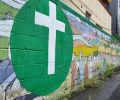 하지만 최근 설문대할망이 그려진 자리에는 초록색 배경에 하얀색 십자가 그림이 덧칠됐다. 즉 설문대할망이 아닌 십자가를 제주민들이 우러러 보는 형상이 된 것이다.