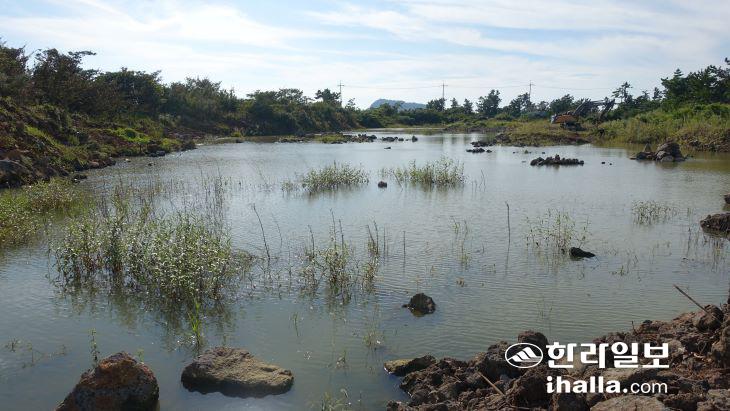 지난 8일 제주시 한경면 고산리의 한 밭. 지목상 전으로 등록된 이곳은 한눈에 봐도 밭으로 보기 어려울 만큼 많은 물이 고여 마치 저수지와 같은 모습을 확인할 수 있었다.