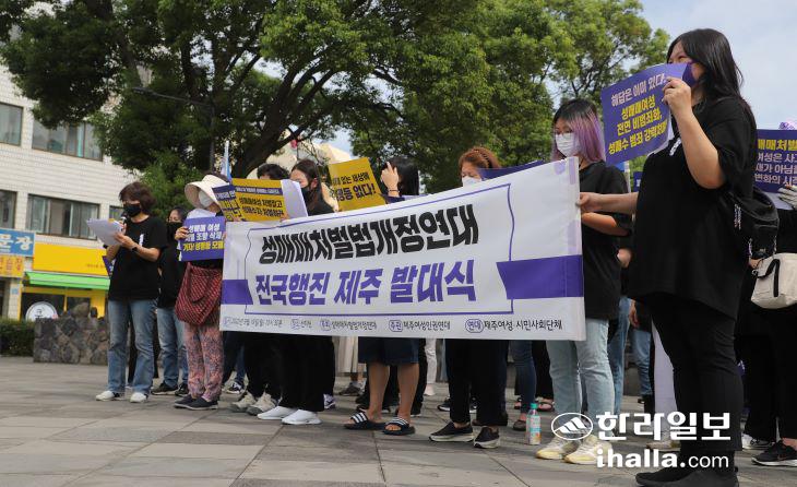 성매매처벌법개정연대가 19일 제주시 산지천 탐라문화광장에서 기자회견을 열고 있다. 김도영기자